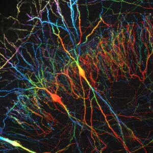 本作品は、記憶や学習にかかわるシナプス可塑性のメカニズムに光を当てた画像です。