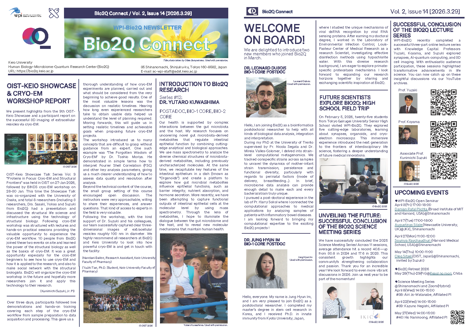 WPI-Bio2Qは、ニュースレター「Bio2Q Connect」の最新号(Vol. 2, Issue 14)を2026年3月29日に発行いたしました 。今月号では、沖縄科学技術大学院大学(OIST)で開催されたクライオ電子顕微鏡(Cryo-EM)のワークショップ報告をはじめ、腸内細菌代謝物に関する最新研究、新しく加わった研究者の紹介、そして次世代へのアウトリーチ活動など、春の活気あふれるBio2Qの動向を特集しています 。
