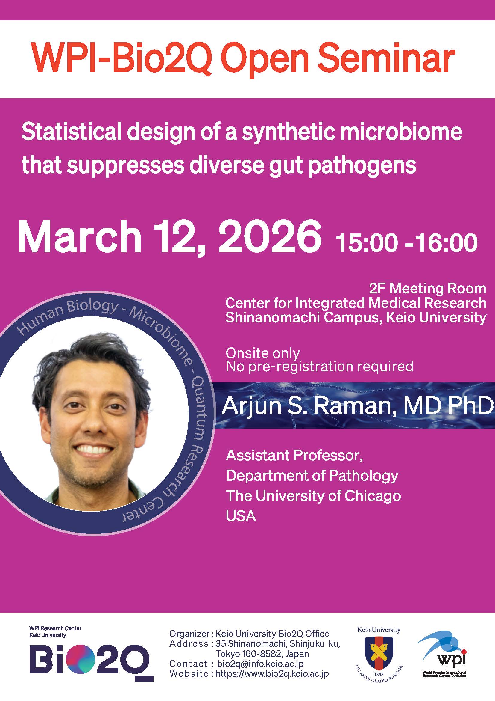 世界トップレベル研究拠点(WPI)慶應義塾大学ヒト生物学-微生物叢-量子計算研究センター(Bio2Q)は以下のとおり公開セミナーを開催いたします。 慶應義塾関係者の方であれば、どなたでもご参加いただけます。 日時 2026年3月16日 (月) 14:00~1...